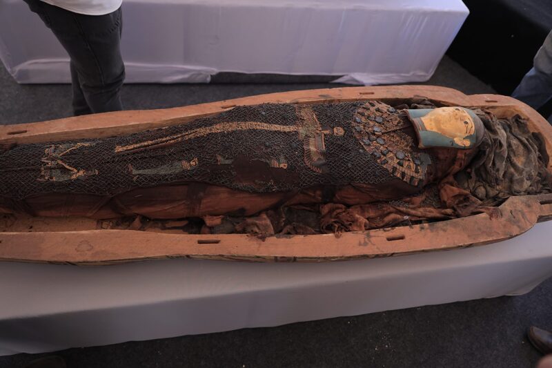 كما تم العثور على إحدى الدفنات التى تحوي تابوت خشبي منقوش  وملون للسيدة “تا دى ايسة” بنت “إيرت حرو” كبير كهنة جحوتى بالأشمونين حيث عثر بجانبها على صندوقين من الخشب يحويان الأوانى الكانوبية الخاصة بها، بالإضافة إلى مجموعة كاملة من تماثيل الأوشابتى وتمثال بتاح سكر ولأول مرة يتم العثور فى الموقع على لفافة بها بردية كاملة بحالة جيدة من الحفظ .