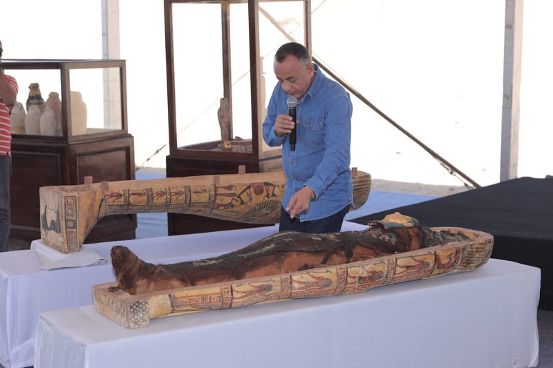 كما تحدث عن تفاصيل الكشف الأثري الذي يتم الإعلان عنه اليوم والذي قامت به البعثة الأثرية المصرية خلال الموسم السابع لحفائرها بهذه المنطقة والذي بدأ في شهر أغسطس الماضي، مشيراً إلى أنه تم الكشف عن جبانة كبار موظفي وكهنة الدولة الحديثة بها العديد من المقابر المنحوتة فى الصخر بداخلها مئات من اللقى الأثرية من تمائم وحلى وتوابيت حجرية وخشبية بها مومياوات، بالإضافة إلى مجموعة من تماثيل الأوشابتى من الفخار والخشب لبعض كبار الموظفين مثل “جحوتى مس” والذى يحمل لقب المشرف على ثيران معبد آمون والسيدة “ناني” التى تحمل لقب منشدة جحوتى.